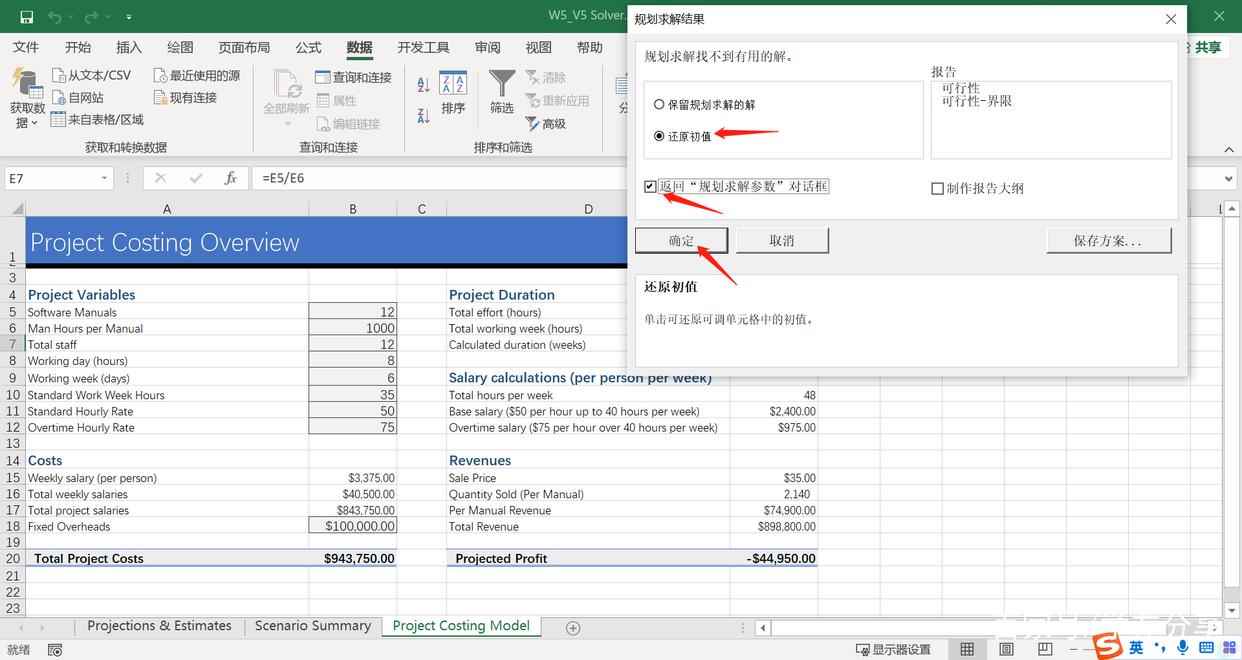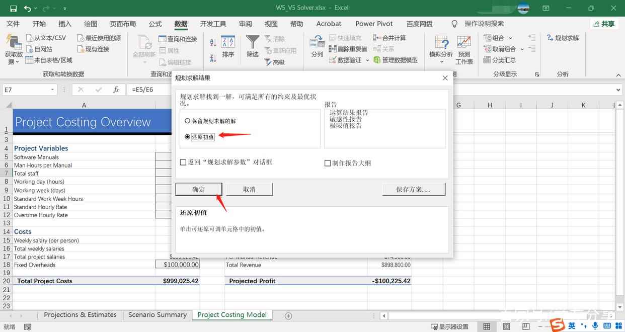 回到“规划求解结果”对话框中,勾选“还原初值”和“返回规划求解对话框”。