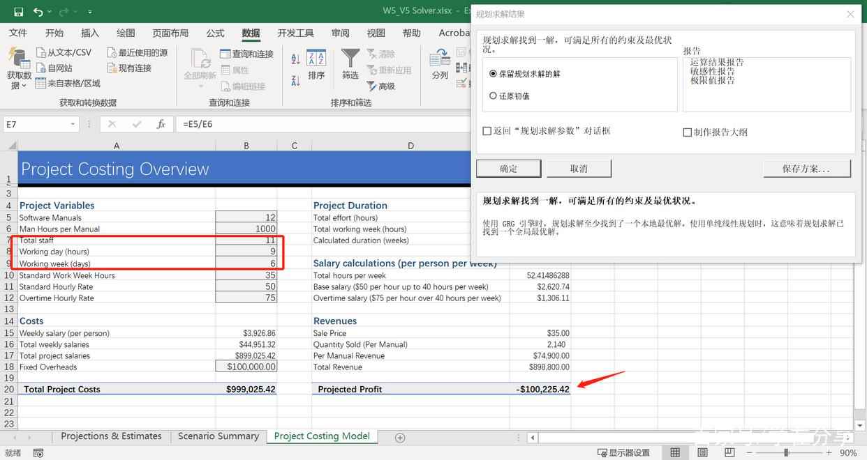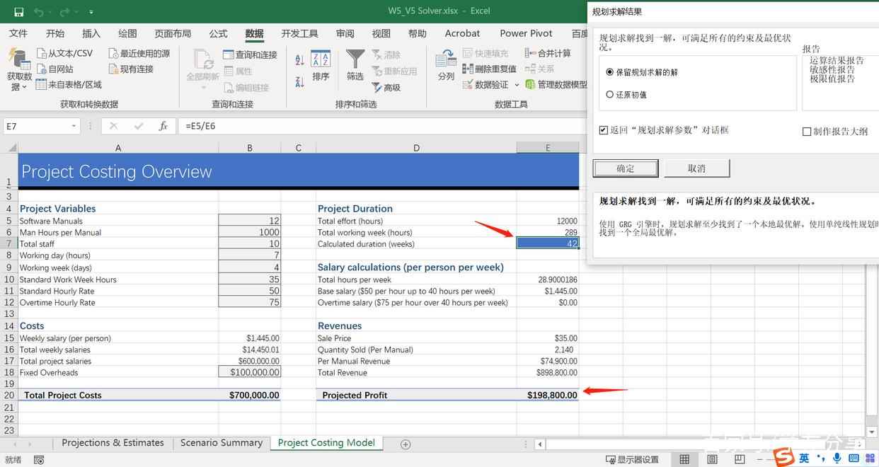 点击“求解”后,我们看到“Projected Profit”为所能达到的最大值,在当前三个变量被约束的情况下,然而“duration”则变成了42,相当于上一个方案的两倍。