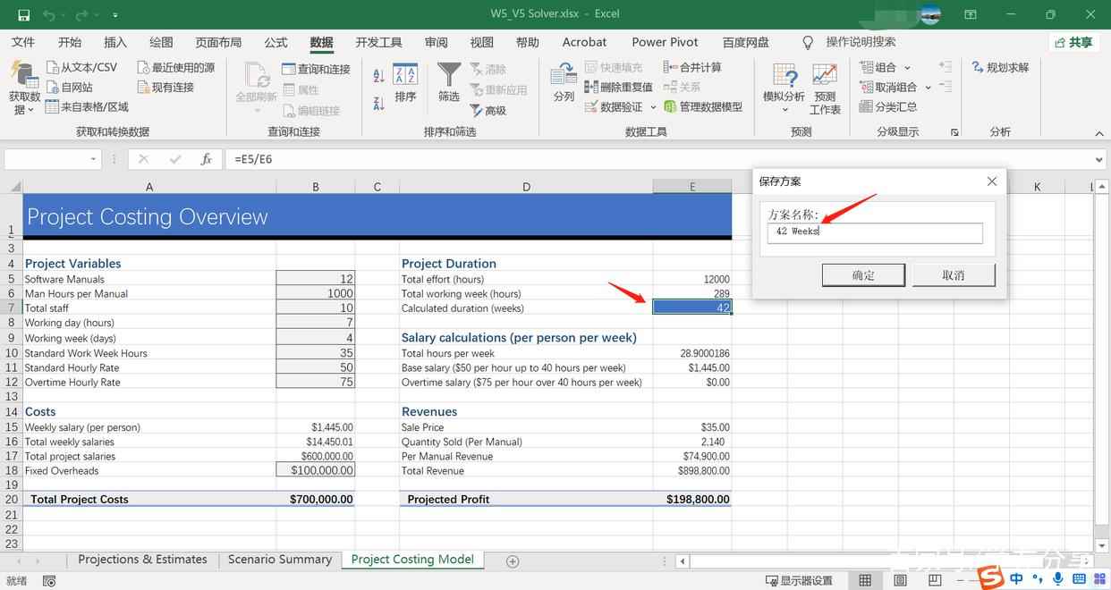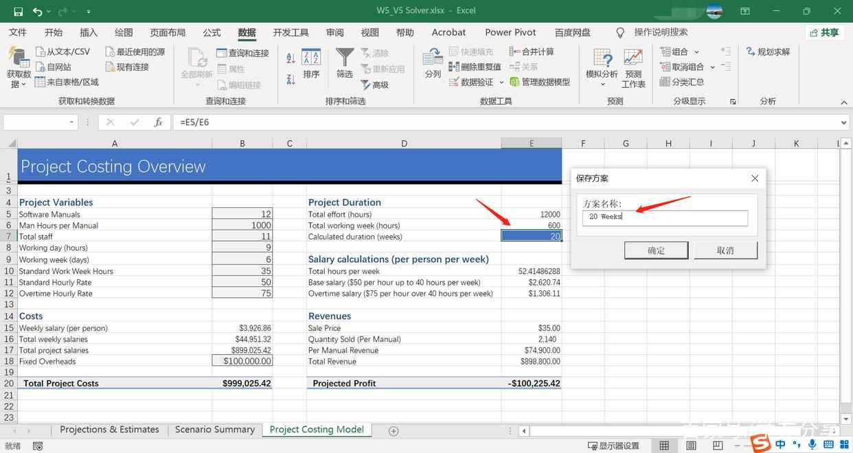 尽管我们不会采纳此方案,但我们仍希望能将其保存,因此当我们点击“保存方案”时,会跳转到另一个对话框,要求我们为此方案命名,我们将其命名为“20 Weeks”,即此方案是“duration”为20的情况。