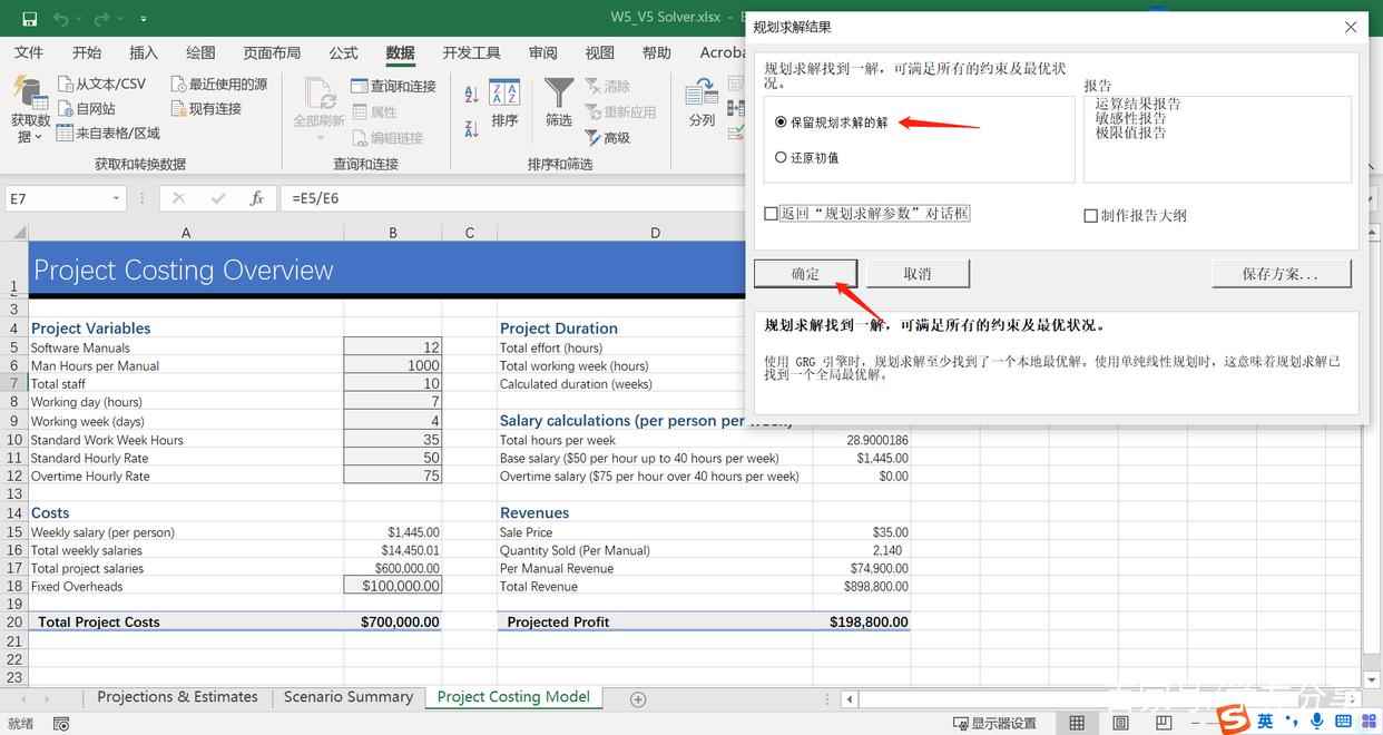 回到“规划求解结果”对话框中,我们这次“保留规划求解的解”,点击“确定”。