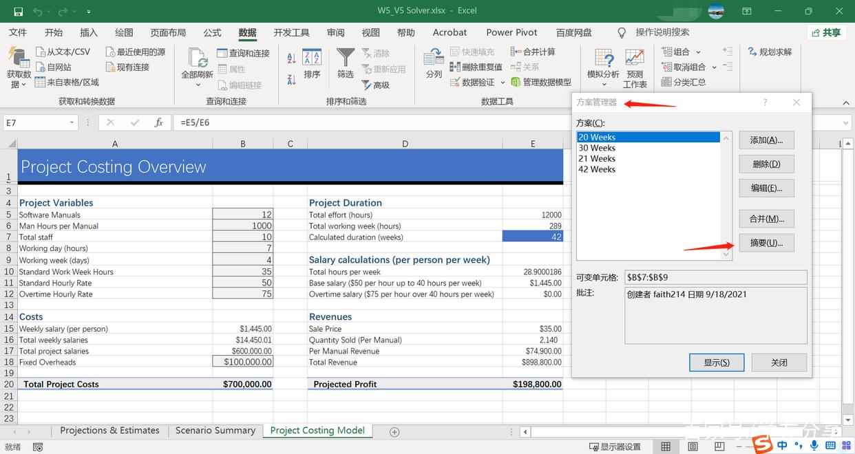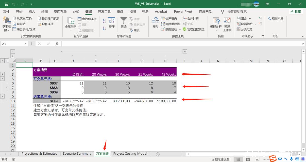 我们最后再次点击“方案管理器”,通过“摘要”来展示不同的方案所得到的结果。