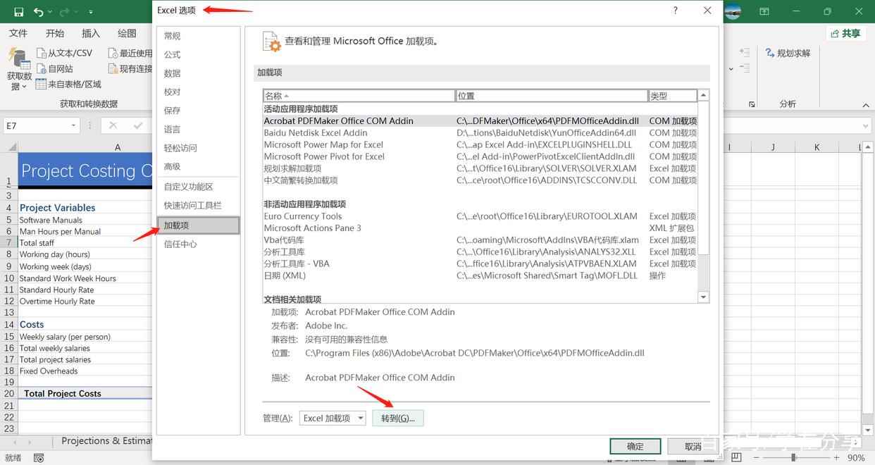 1. 打开“Excel选项”对话框,点击“加载项”,再点击管理Excel加载项的“转到”。