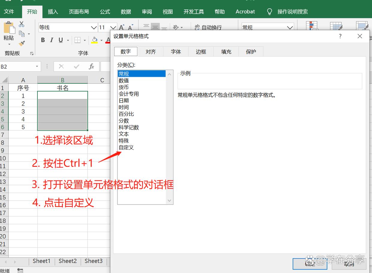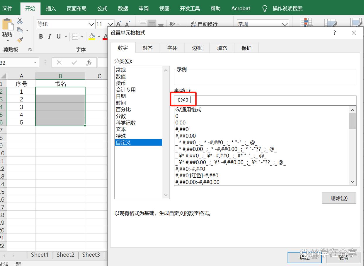 把之前的数据delete,然后选中书名的单元格区域,按Ctrl+1,打开设置单元格格式的对话框后,选择自定义。