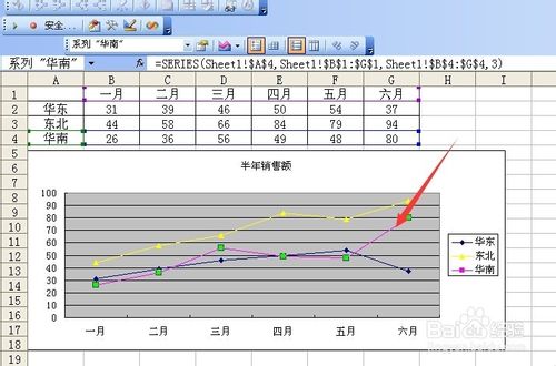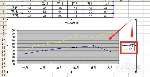 1、如图所示的是一个带有折线图图表的源数据工作表 箭头所指向的叫做图例 图例里有三个图例项