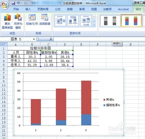 发现没有,这里是采用Excel 2007中的柱形图来绘制分段条图。