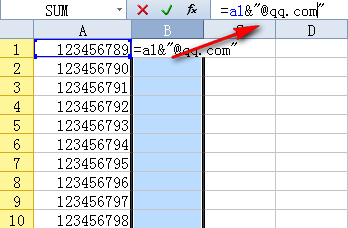 2、然后在单元格内输入公式“=a1&"@qq.com"”,如下: