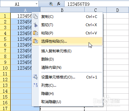 7、我们再选中A列,右击,选择“选择性粘贴”,再点击它,如下: