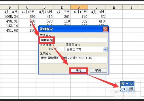 输入制作表格作为宏名 单击确定按钮开始录制宏 此时excel应用程序窗口中显示 停止录制工具栏 如果不给excel指定宏名 excel会以macrol作为默认的宏名 宏可以保存在个人宏工作簿或当前工作薄 如果保存在当前工作薄 只有该工作表薄打开时 宏才可用