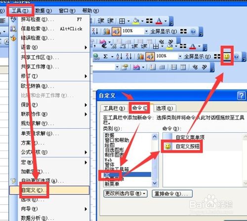 excel宏的录制和执行及把宏指定给图片或按钮 excel宏命令可以通过工具 宏来实现 指定宏给图片 按钮时 可以通过先添加图片和按钮 添加图片直接插入即可 添加按钮需要在工具自定义 命令 左侧的类别找到宏 然后将自定义按钮拖动到工具栏 然后单击或右键指定宏