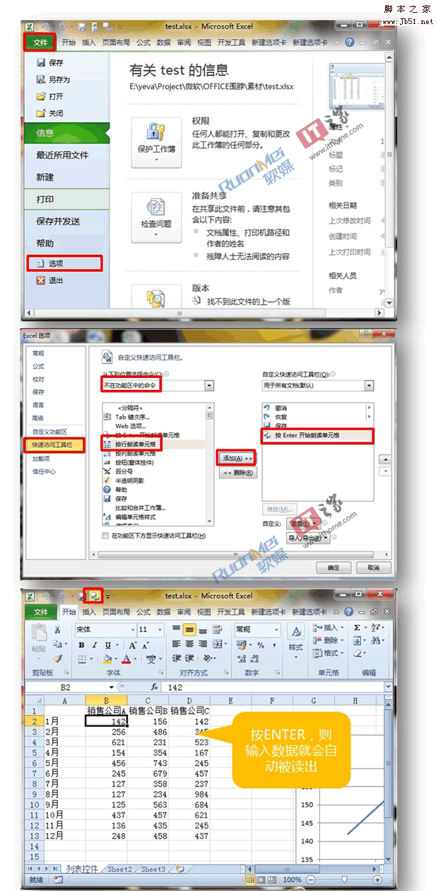 Excel 自动读取单元格内容功能,方便大家平时录入数据内容时即刻通过读音校对,为你的眼睛减压,让眼睛耳朵协调工作!“文件”-“选项”-“快速访问工具栏”-“不在功能区中的命令”-添加“按行朗读单元格”-“直接单击Enter“即可!