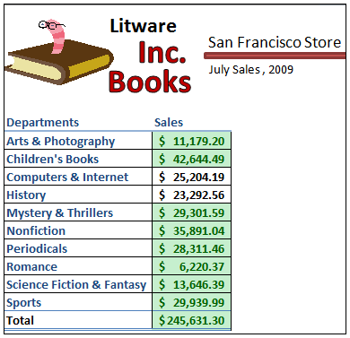 下面我们应用条件格式,以便能够容易判断是否位于本地分支机构的部门与该公司其它分支机构相比做得更好或更差。让我们使用San Francisco分支机构作为我们的示例。我们将应用绿色背景填充那些比平均值高的部门。