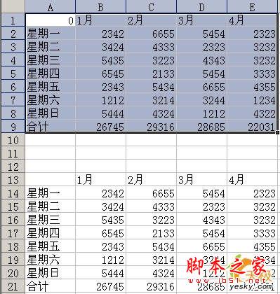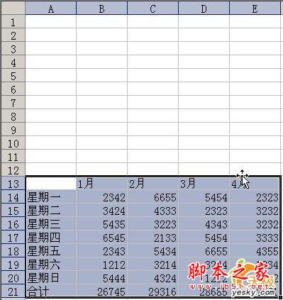 1.例如,我们要将如图1所示的A13:E21中的内容复制到A1:E9处。首先选中A13:E21。