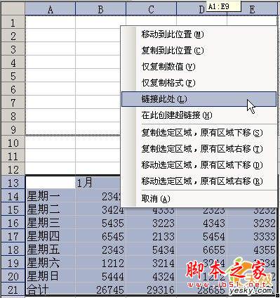 3.这时按下鼠标右键拖动鼠标,当移动到A1:E9时,松开右键,出现如图3所示菜单,单击“链接此处”。