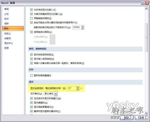 当使用Excel 2007打开过若干工作簿后,单击“Office按钮”就会看到在右边窗格中列出最近使用的文档列表。默认情况下这个列表的数目为17,我们也可以将其更改为从1到50之间的任意数值。单击“Excel选项”对话框中的“高级”选项卡,然后在“显示”区域的“显示此数目的‘最近使用的文档’”右侧设置自己所希望的数值即可,如图2所示。