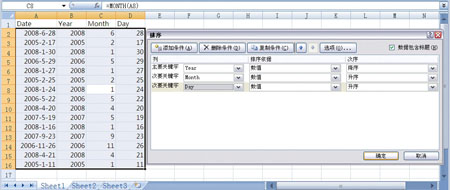 单击Excel 2007表格中的任意一处,依次点击“开始”-“排序和筛选”-“自定义排序”,然后在弹出的“排序”对话框中完成如下设置:主要关键字为“Year”,排序依据为“数值”,次序为“降序”;然后单击“添加条件”按钮,同主要关键字类似,依次设置为“Month,数值,升序”;再次单击“添加条件”设置为 “Day,数值,升序”,完成上述设置后单击“确定”。得到你需要的排序数列以后,就可以隐藏或者删除我们为了排序所添加的那三列数据。