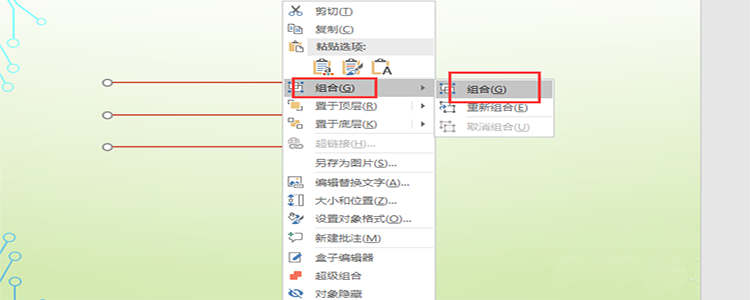 2、组合3条横线。将这3条横线组合成一个整体,选中3条横线,然后右键单击,在弹出的菜单中选择“组合”。