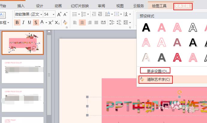 6、如果不喜欢当前艺术字,直接选择文字,点击插入-艺术字,更换其他艺术字即可。更多设置或者清除艺术字在菜单栏文本工具中。