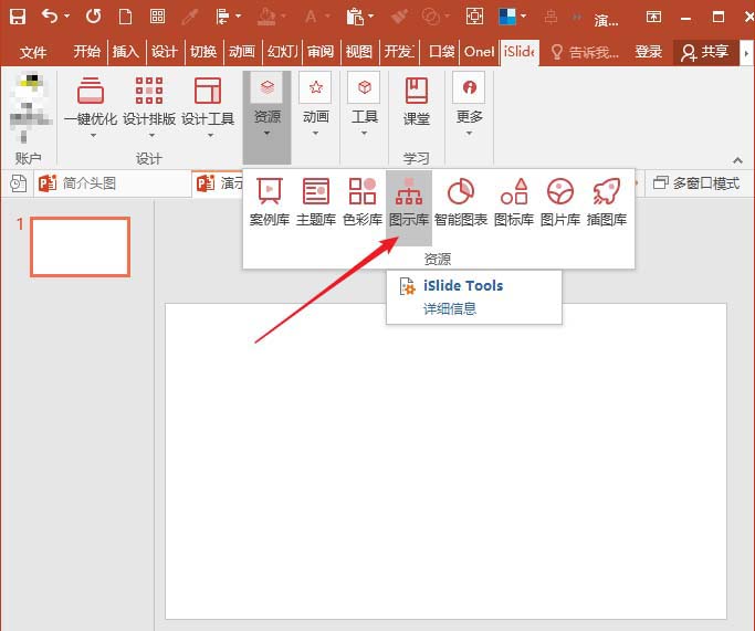 2、点击iSlide选项卡下资源工具组中的图示库菜单。