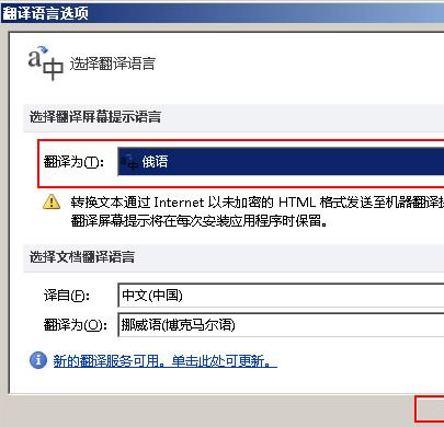 4、此时窗口会弹出一个“翻译语言选项”的对话框,在“翻译为”后面的倒三角的下拉按钮下选择自己需要翻译的语言,例如“俄语”,然后点击确定;
