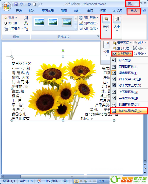 1.以文档1中的图片和文字为例,鼠标左键单击选中要更改文字环绕方式的图片,切换到【图片工具】—【格式】选项卡,单击【排列】功能面板,在弹出的下面板中点击【文字环绕】,任选一个文字环绕方式,这里选择【紧密型环绕】为例。