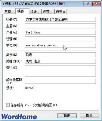 第2步,在打开的文档属性对话框中切换到“摘要”选项卡,分别输入作者、单位、类别、关键词等相关信息,并单击“确定”按钮即可,如图2所示。