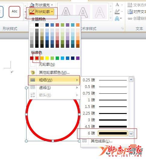 3、设置圆形的填充为无,形状轮廓为实线、正红色,实线的粗细根据自己的需要来设置,一般为6磅;(Word2003用户,只要鼠标双击正圆形,设置的对话框就出来了)