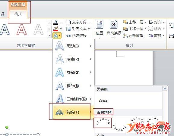 Word2010插入艺术字的方法略有不同,点击插入艺术字,输入好文字后,点击“文字效果—转换—跟随路径”,选择其中的第一个;