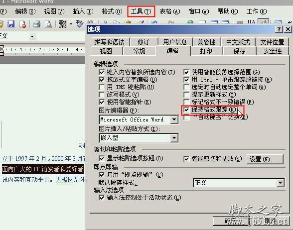 单击Word“工具→选项”命令,打开“选项”对话框,在“编辑”选项卡中勾选“保持格式跟踪”复选框即可。