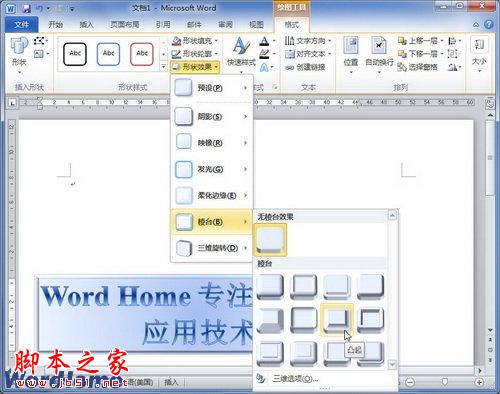 第3步,打开形状效果菜单,指向“棱台”选项。在棱台列表中,将鼠标指向任意一种棱台效果,则Word2010文档中的艺术字将实时显示最终效果。确认使用该棱台效果后单击该效果即可。
