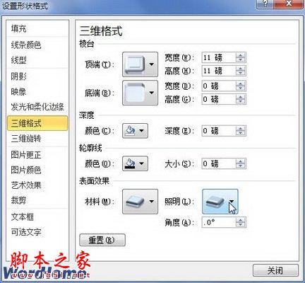 打开“设置形状格式”对话框,在“三维格式”选项卡中,用户可以对棱台顶端和底端的高度和宽度进行设置,也可以设置棱台深度和轮廓线的颜色。另外对棱台的表面效果进行材料和照明方面的设置,能够明显改变艺术字的棱台效果。完成设置后单击“关闭”按钮即可。