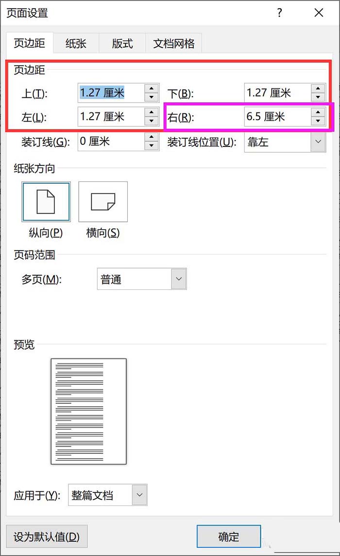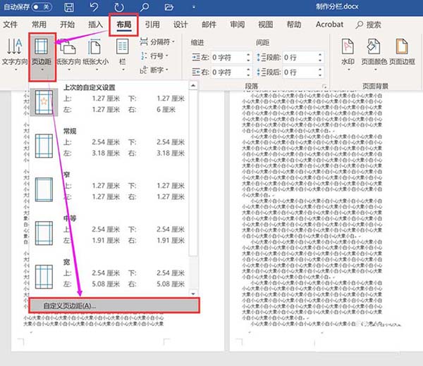 2、为了展示更多的文字,将上下左边的页边距变窄;为了制作分栏,右边距加宽。