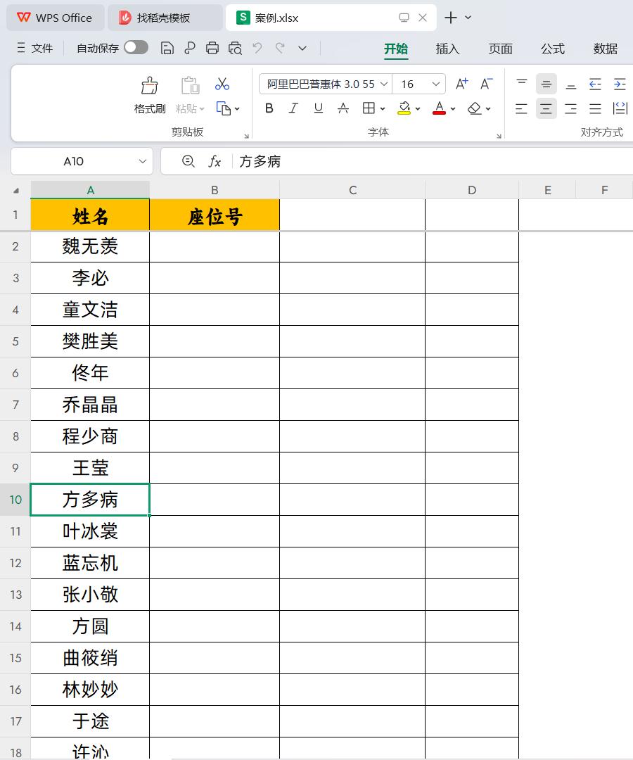 演示案例一共有50个考生,考生姓名参见下图A列(截图只截取了一部分),B列存放座位号。