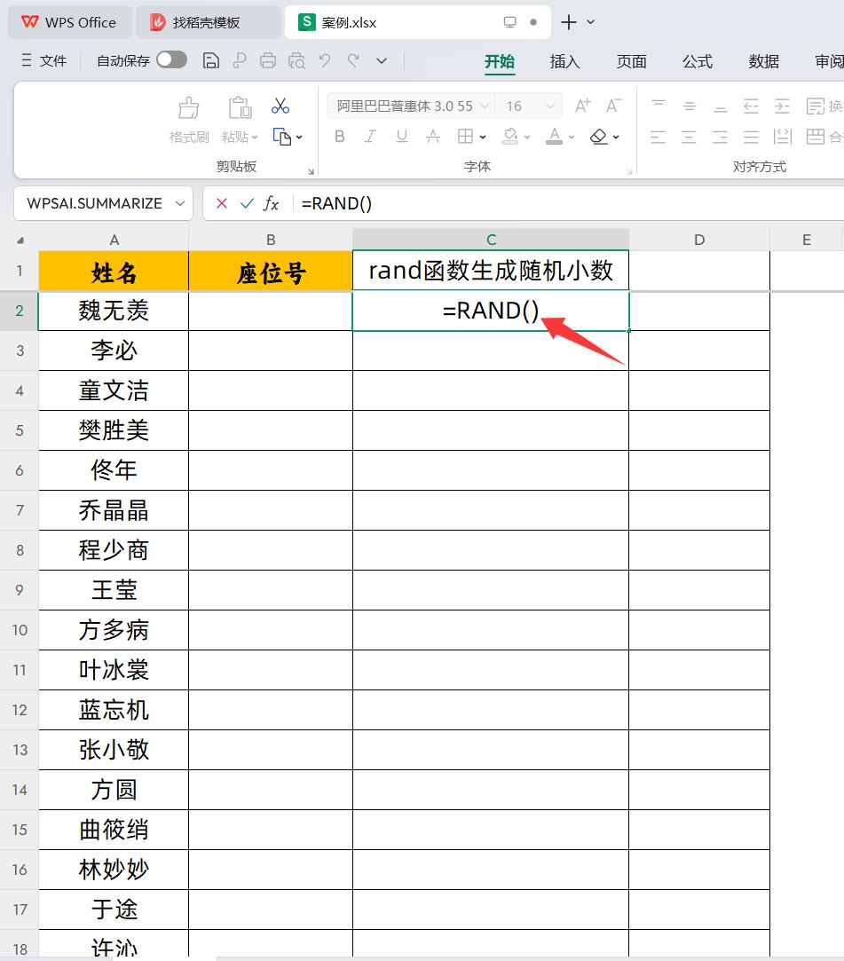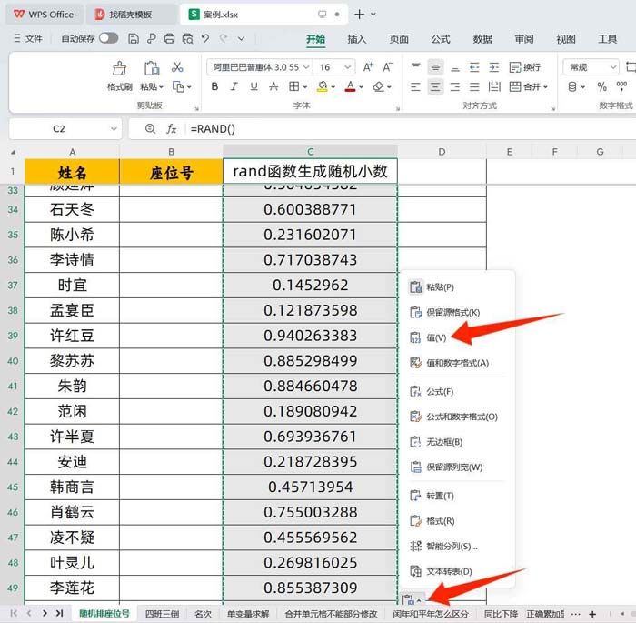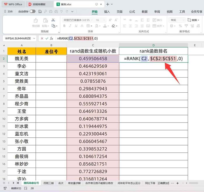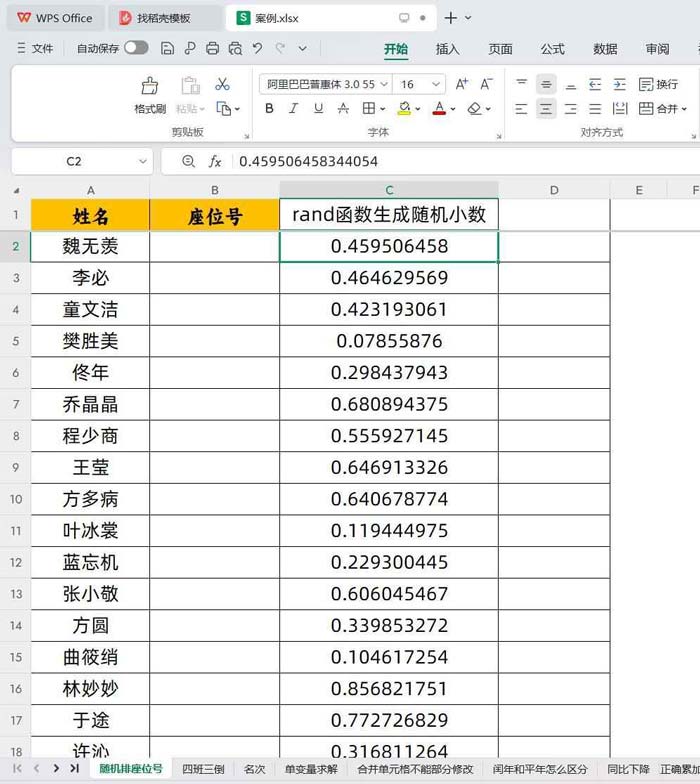 选择C列作为辅助列,用rand函数生成随机小数。在不限定小数位数的情况下,rand函数生成重复值的可能性接近0。