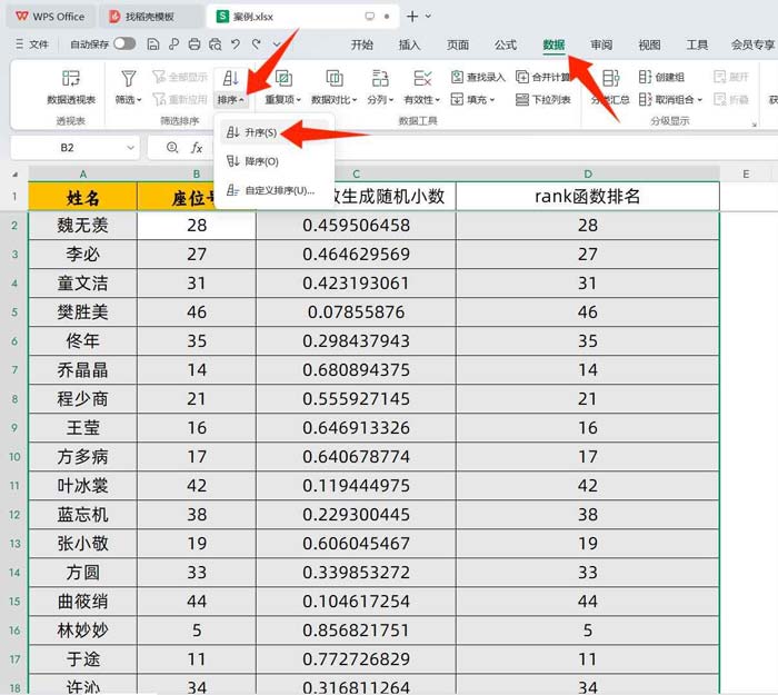 选中B列中的任一座位号,在【数据】选项卡下点击【排序】按钮下拉箭头,在下拉列表中选择【升序】。这样50个考生的座位号就排好了。