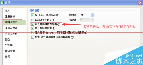 2、编辑与显示---输入时提供推荐列表(勾选去掉)---确定。
