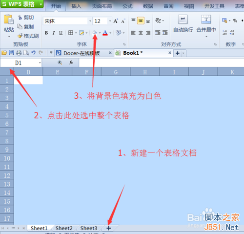 1、打开wps表格软件,新建一个表格文档,选中图中2所示的位置,将整个表格选中,然后将背景色填充为白色。