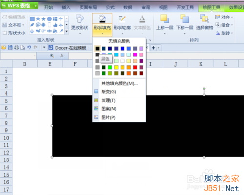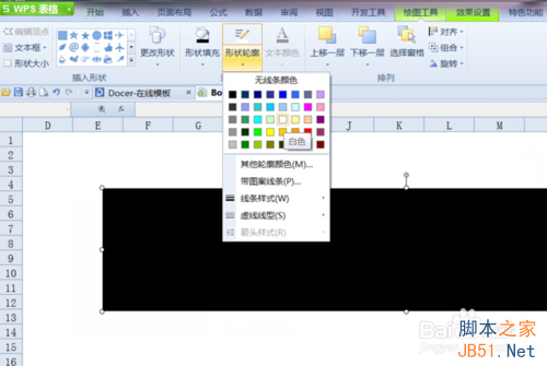 2、点击“插入”菜单,找到“形状”中的“基本形状”,选中矩形并在空白处画一个长方形矩形出来,点击“形状填充”将背景色填充为黑色,再点击“形状轮廓”轮廓填充为白色。
