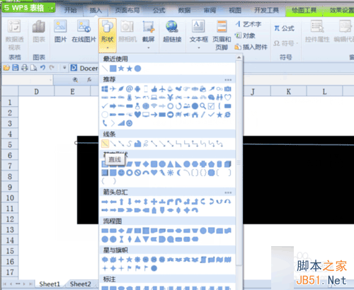 3、点击“插入”选择其中的“形状”在其下拉菜单中选择“线条”——直线,在矩形框中绘制出一条直线来。