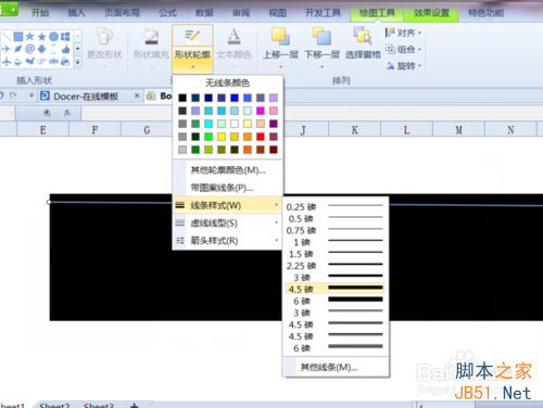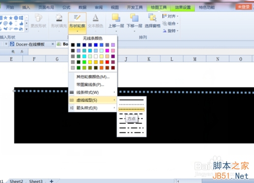 4、单击“形状轮廓”在其下拉菜单中选择线条样式为4.5磅的实线,再单击形状轮廓将——虚线线型——方点,再单击形状轮廓,将填充色选择为白色。