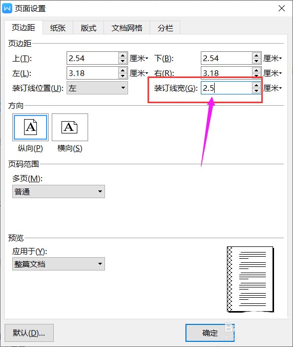 5、设置“装订线宽”的数值大小,如2.5厘米,如下图所示: