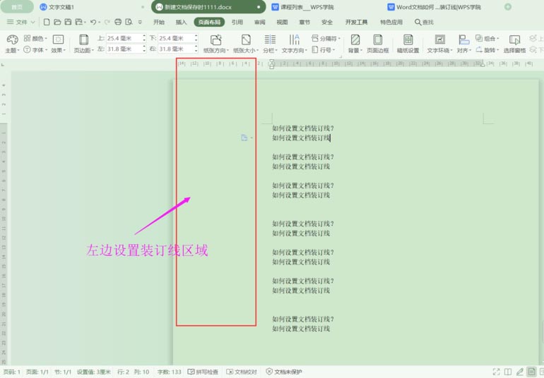 6、装订线装订位置和装订线宽设置好后,就可以看到下图所示结果。