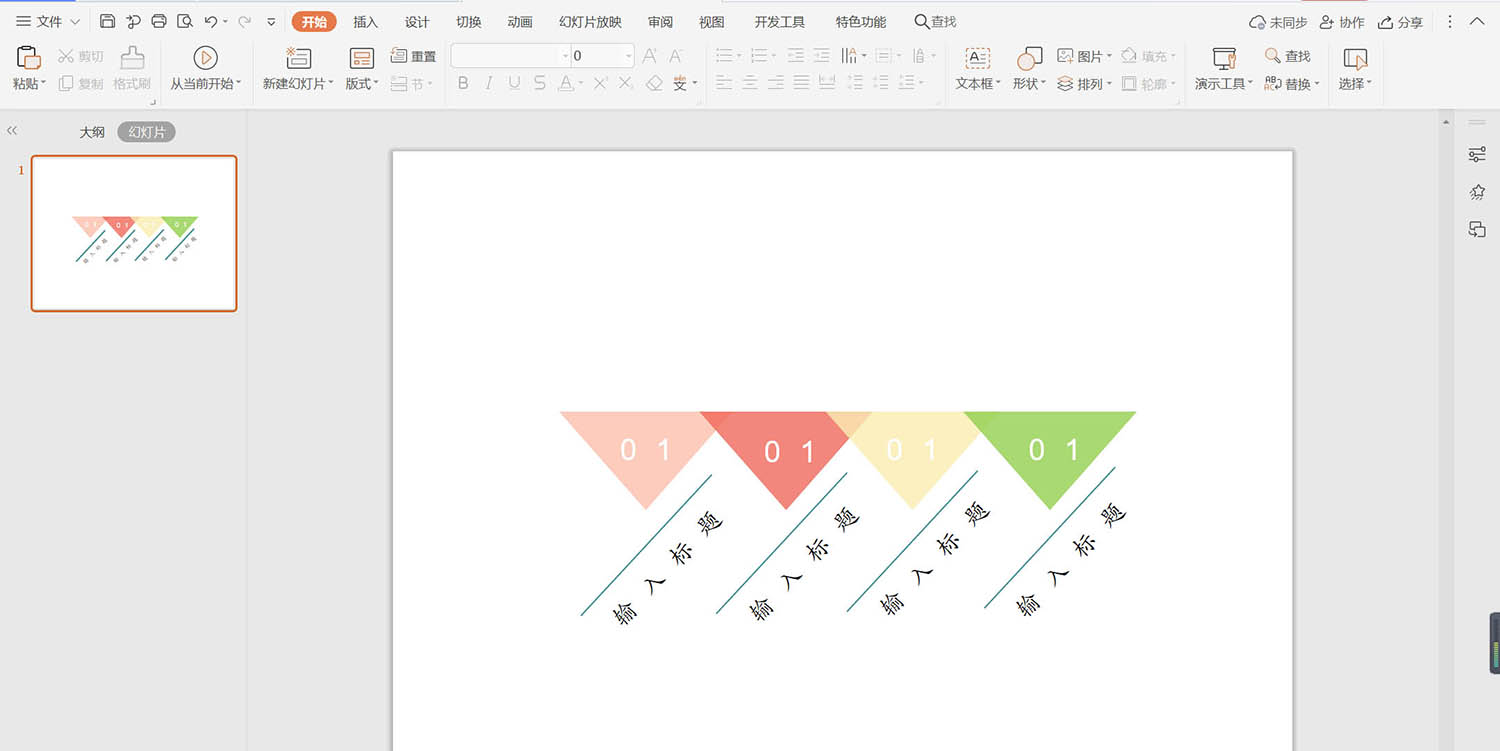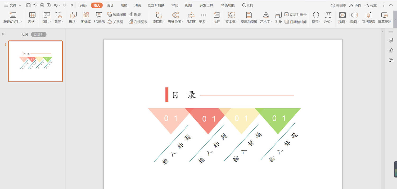 6、在三角形中输入序号,字体填充为白色,在直线位置处输入标题,这样炫彩杂志风目录样式就制作完成了。