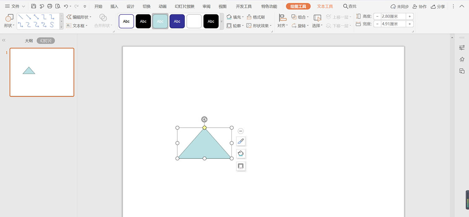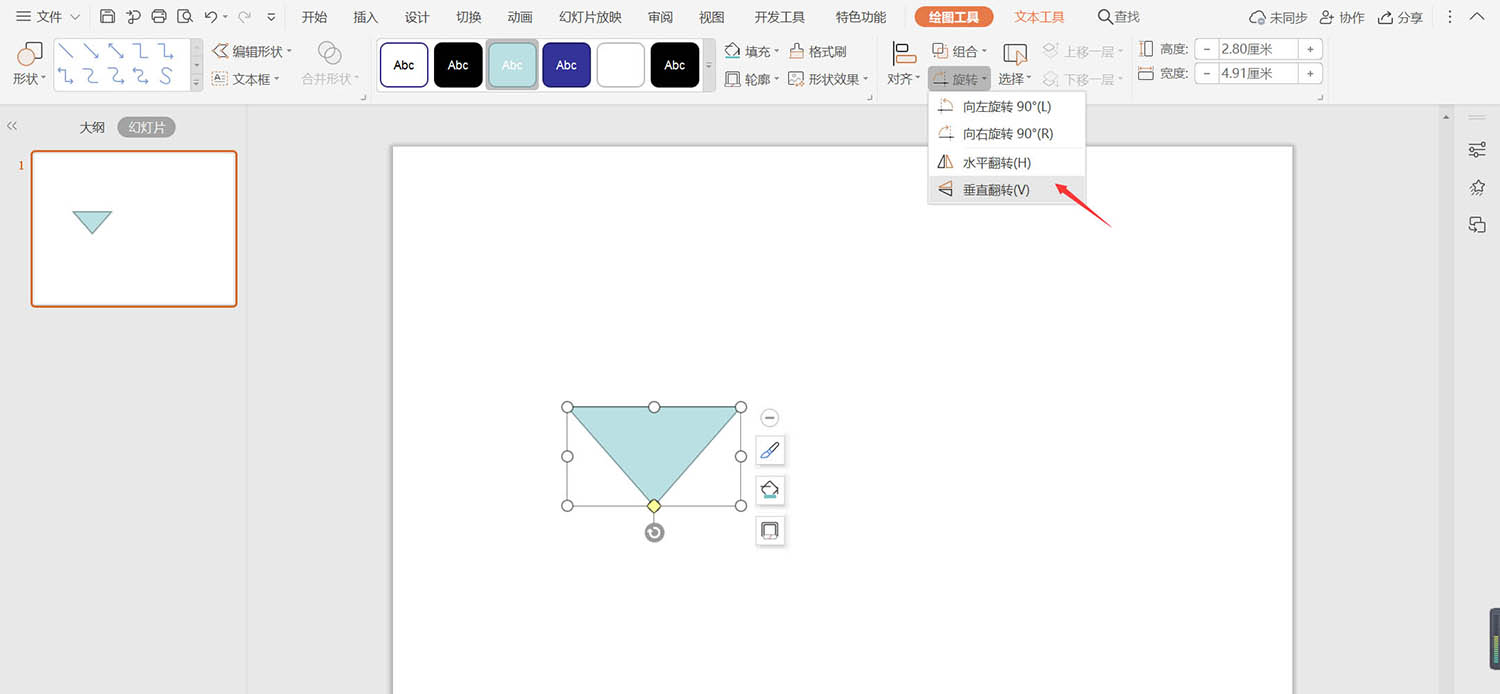 2、选中等腰三角形,在绘图工具中点击旋转,选择其中的“垂直翻转”。
