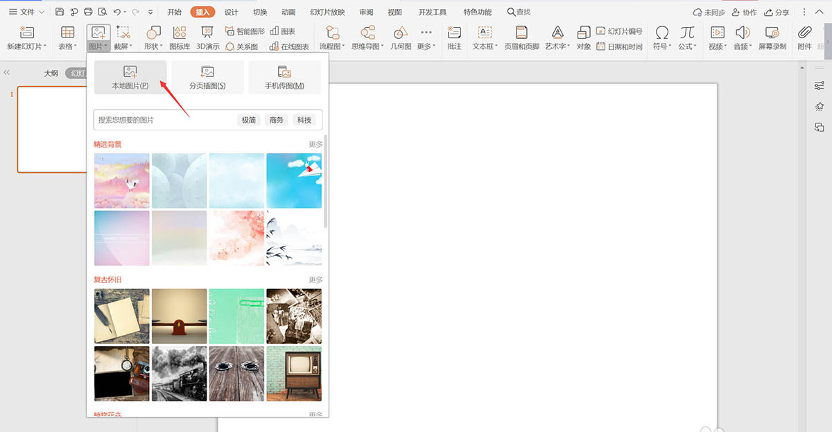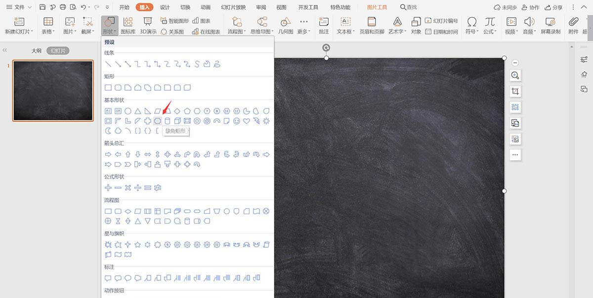 1、在插入选项卡中点击图片,选择其中的本地图片,插入一张黑板背景图片。