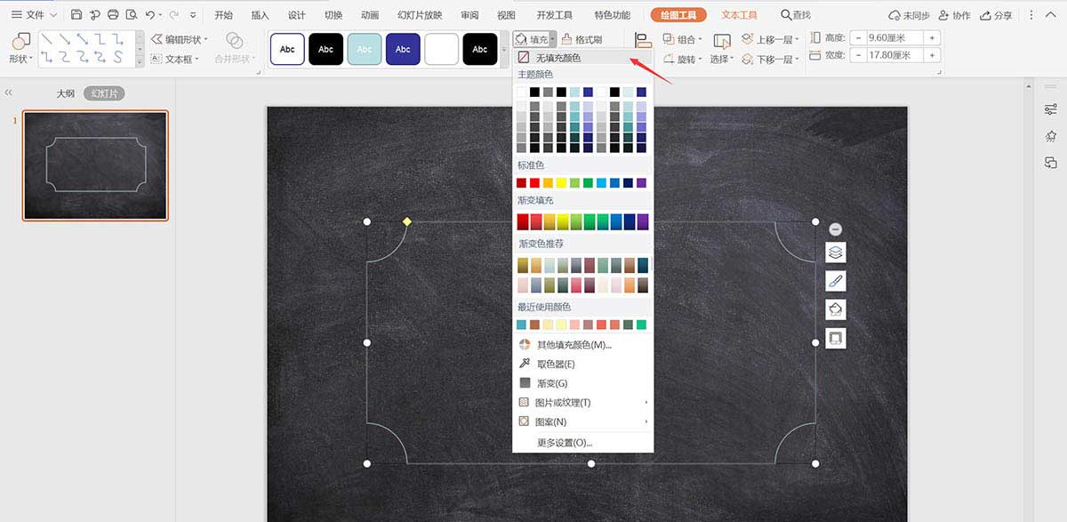 4、选中缺角矩形,在绘图工具中点击填充,选择其中的“无填充颜色”。
