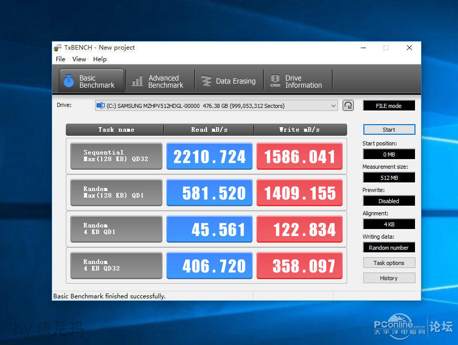 TxBENCH 三星SM951 512G 持续读取2210.724MB/s ,持续写入1586.041MB/s