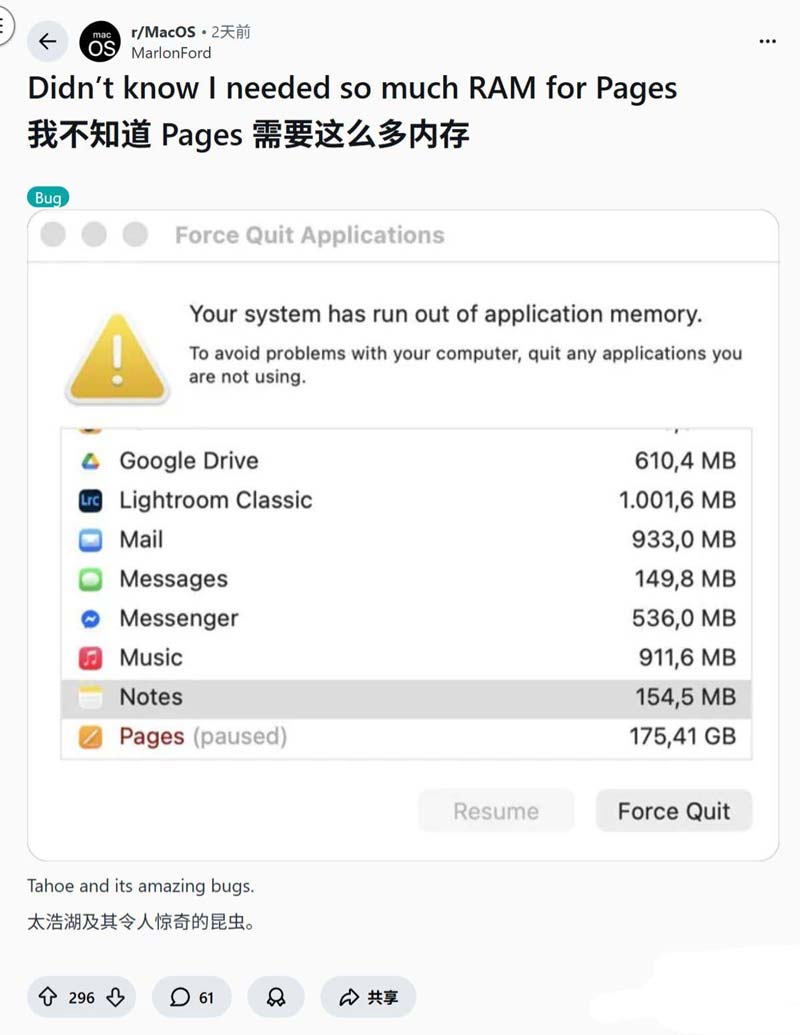 部分升级macOS 26.0.1 Tahoe系统致多应用内存泄漏/设备卡顿:附临时解决办法