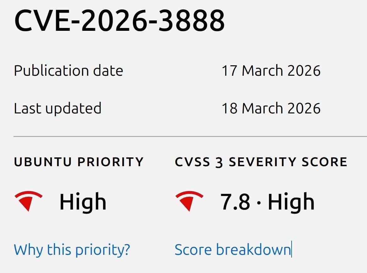 我们援引公告内容,该漏洞追踪编号为 CVE-2026-3888,存在于负责软件沙盒隔离的 snapd 组件中,CVSS 评分为 7.8(满分 10 分,分数越高代表越危险)。