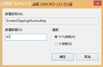 4、双击新建键值,修改为41,将Onenote的屏幕截图的快捷键改为:Win+A组合键,使用F5刷新注册表,生效。