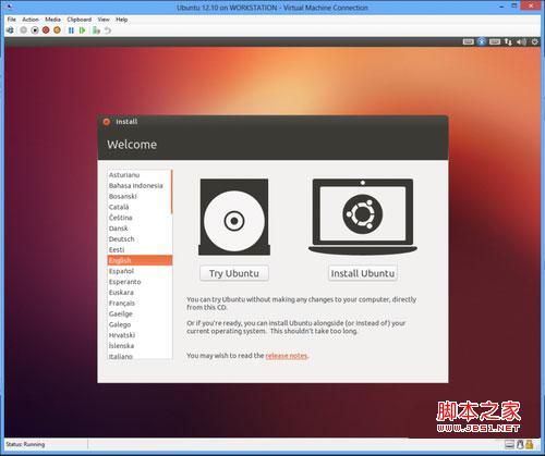 接下来,你要单击“控制台”。由于我们正在安装的桌面Ubuntu的版本,在Windows 8的Hyper-V机器有一个漂亮的图形安装程序。我们可以在弹出的窗口选择安全Ubuntu。这样我们就快速的进入安装系统了。